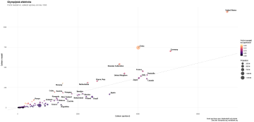 Data nás zkrátka baví a tak si občas pohrajeme se zajímavým zdrojem. Teď se nabízelo prozkoumat olympijská data, která nám odhalila zajímavé souvislosti. Porovnali jsme velikosti výprav jednotlivých zemí a počet získaných medailí, kumulativně v letech 1990 až 2025.