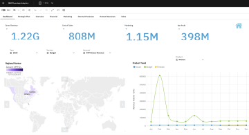 Přehledový dashboard, který zobrazuje klíčové ukazatele výkonnosti jako tržby, náklady, marketingové výdaje a čistý zisk. Součástí je i regionální mapa a produktový trend srovnávající skutečnost, rozpočet a predikci. Interaktivní prvky umožňují snadnou analýzu podle roku, účtu či produktu.