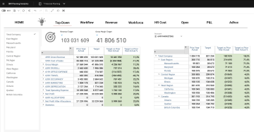 Ukázka interaktivního dashboardu zaměřeného na řízení tržeb a nákladů metodou Top-Down. Vizualizace porovnává cíle s hodnotami předchozího roku na úrovni celé společnosti i jednotlivých regionů a nákladových kategorií.